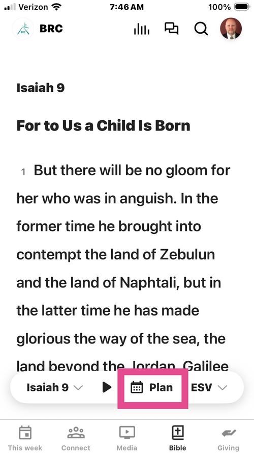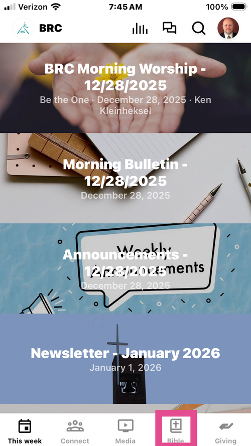 1. Open the BRC church app and select the Bible button at the bottom of the screen