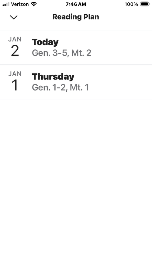 3. Select the entry for the current date. If you miss one feel free to select it and catch back up. If you follow this plan you will read through the entire Bible in one year reading from the Old and New testaments each day.